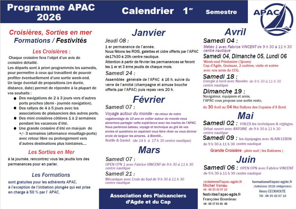 But de L’ A.P.A.C : pratique de la navigation de plaisance, sous toutes ses formes et sur tous les plans d’eau. Nos adhérents, propriétaires de voiliers ou vedettes de toutes tailles, sont des amoureux de la mer qui partagent le plaisir de la navigation dans la convivialité.